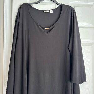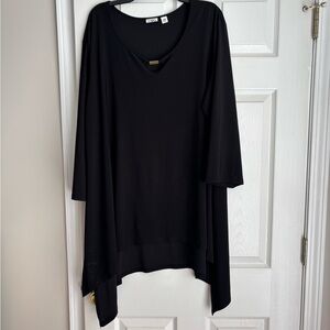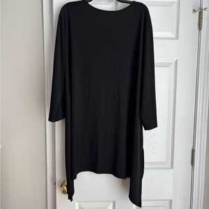 Elegant black blouse with asymmetrical hem. Features a scoop neck and three-quarter sleeves. Perfect for any occasion.