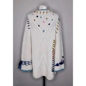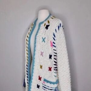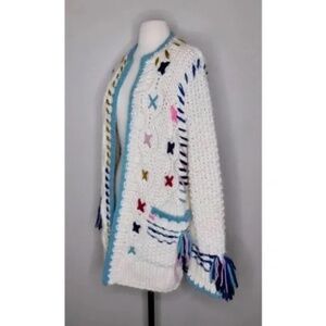 Open front ... no closures ~ Long sleeves ~ Two large patch pockets on the front ~ Straight hemline ~ Slip-On styling ~ Varying cable knit pattern are used on the two sides of the front ... and on the back ~ Soft chunky knit fabric ... mostly an alpaca which gives it a *fuzziness* ~ Oversized, rustic looking hand embroidered details ... including fringe accents on the sleeves & pockets ~ Sweater is a creamy off-white with aqua trims ... embroidered details are done in shades of pink, navy mustard-olive, teal, aqua, lavender & red