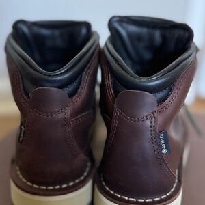 Sturdy Danner boots in dark brown leather. Green laces add a pop of color. Ideal for rugged terrain.