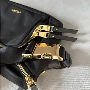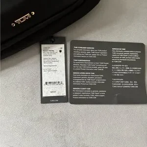 Stylish and functional, the TUMI black belt bag features elegant gold accents. Perfect for keeping essentials close and secure. Amazing quality, never used. Still with tags.