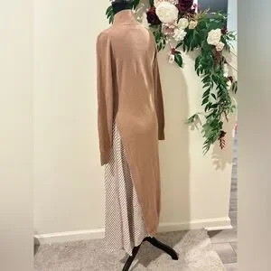 Brown knit (90% Wool, 10% Cashmere). A-line. Long sleeves. Turtleneck. Pull on. 45" from shoulder to hemline. Imported.
