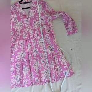 Charming pink dress with floral pattern. Features long sleeves and collar.