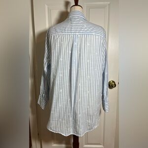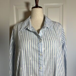 Casual button-down with light blue and white stripes. Features subtle embroidered details. Ideal for relaxed outings. Gently worn and in great condition! Comes from a clean, smoke-free home. Thanks for checking out my closet!