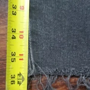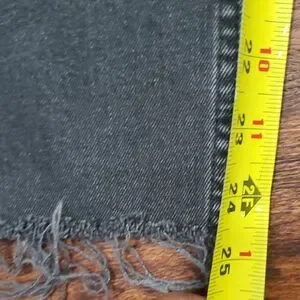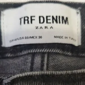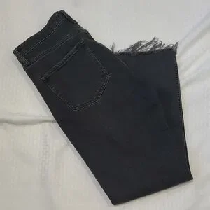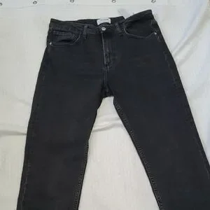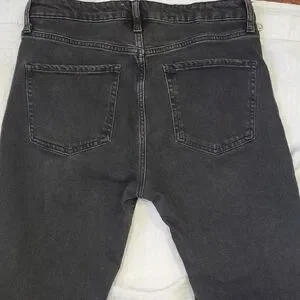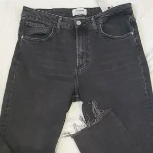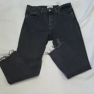 Edgy charcoal jeans with distressed hems. Straight fit for versatile style.