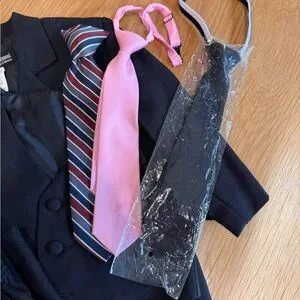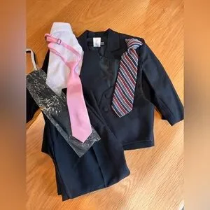 This elegant toddler suit set features a classic black jacket and pants, complemented by a stylish striped tie, pink tie (used), and black tie (unopened). Perfect for formal occasions.