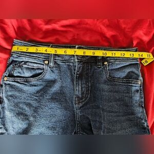28 waist, one tag says "regular" length and the other says "34L". They are tall girl friendly, but not quite 34"