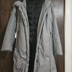 Stay warm on the slopes with this stylish gray ski jacket. Perfect for winter adventures. My daughter wore this one semester of college at Minnesota. SO warm! 2 zipper closure , snaps, zipper pockets, warm hood. Slight stain on back of right arm. Expensive jacket!