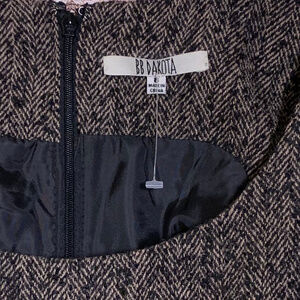 BB Dakota Serena Leather Dress. Skirt is genuine leather. New with tags. This NEW BB Dakota Serena Tweed and Leather Dress is a unique combination of classy and sassy. Tan and ivory wool-blend tweed bodice creates a Scottish schoolgirl feel, with a rounded neckline and darts at bust. Hidden back zipper/hook clasp. Fully lined.Upper Bodice: 59% Polyester, 36% Wool, 3% Viscose, 2% Acrylic. Skirt: 100% Leather. Polyester Lining. Size 8