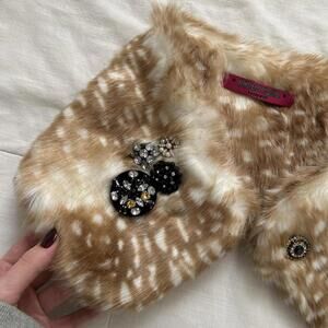 Anna Sui Dollygirl Bambi deer print faux fur neck scarf with black and gold jewel pin detailing. Perfect for winter coquette styling. From Japan.