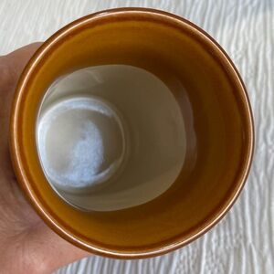 Set of two vintage stoneware mugs. Deep royal blue base with warm brown upper rim around top. Perfect to enjoy a hot beverage on cold a cold day. 14oz