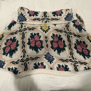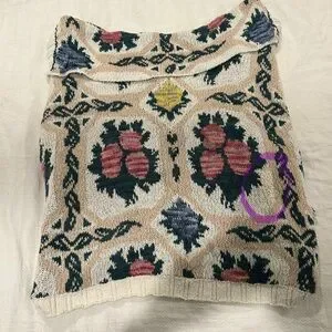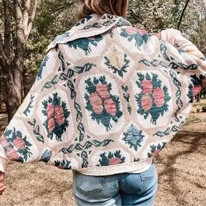 This gorgeous shrug style sweater is so cozy for fall. It is gently worn and has 1 small repair on the back (see last 2 photos) but the print is so busy, the repair is not noticeable.