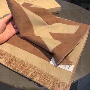 This Burberry scarf features a bold monogram design in warm brown tones, crafted from a premium wool-blend fabric with fringed edges. It merges the brand’s heritage with modern style