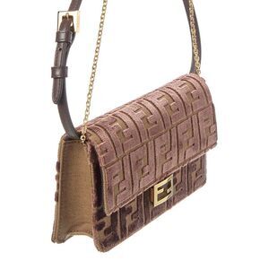 About the brand: Innovative and elegant Italian luxury. Made in Italy Baguette FF Velvet & Leather Wallet On Chain in brown FF velvet and leather with gold-tone hardware and interchangeable shoulder straps Interior design details: leather lining, interior pocket, card slots Measures 8in wide x 4.75in high x 1.5in deep Removable shoulder strap drops 23in Adjustable and removable shoulder strap drops 18in Fold-over flap with magnetic closure Please note: All measurements were taken by hand and are approximate; slight variations may occur. Our products are 100% genuine. In some cases we purchase merchandise from trusted independent suppliers and not directly from the brand owner. In all cases we stand by the authenticity of every product sold on our site.