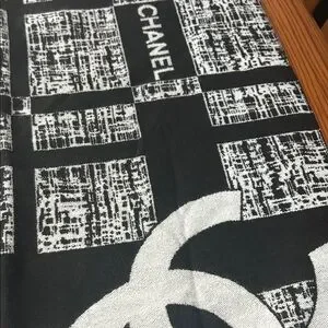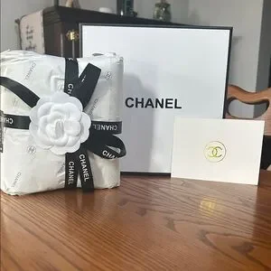 Brand NEW! Chanel logo scarf/throw set featuring a monogrammed ribbon and box. Adorned with a signature camellia flower. Includes a branded card.