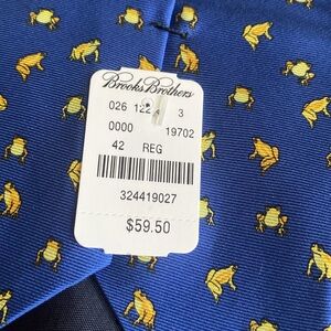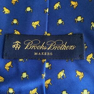 NWT Brooks Brothers Makers 100% silk tie. Blue with all over yellow frog print. Printed in Italy; Made in USA.