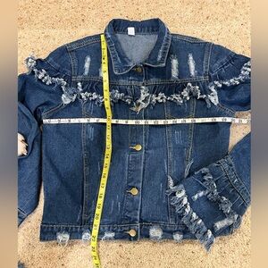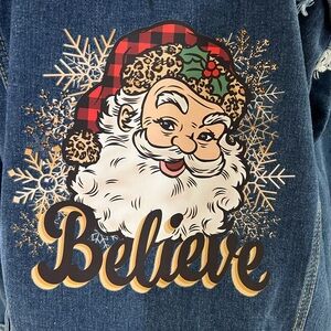 Stylish denim jacket featuring a Santa graphic with 'Believe' text. Unique fringe detailing on sleeves and back. Size XXL.