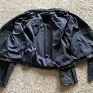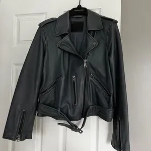 Stylish slate blue leather jacket by All Saints. Features zip details and a belted waist. Only worn once.