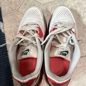 Nike Air Max shoes with a white base and bold red accents. Designed for style and comfort.
