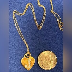 This 14k Solid Gold JSC K Pendant Necklace features a heart-shaped pendant with the letter "J” engraved on it, creating a charming and elegant look. The necklace comes with a solid 14k gold chain and a spring ring closure, making it a versatile piece suitable for any occasion. The pendant is signed by the brand JSC and is crafted in yellow gold, adding a touch of luxury to the overall design. This necklace is a perfect choice for anyone looking for a high-quality and stylish piece of fine jewelry. Never worn and from my personal jewelry collection. It comes from a smoke free home.