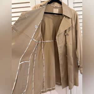 Stylish tan trench coat. Double-breasted with button details. Perfect for any occasion.