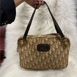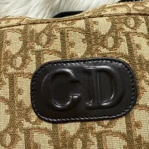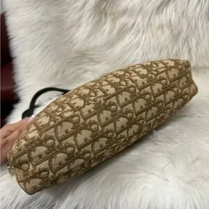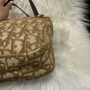 Chic Dior shoulder bag with iconic monogram pattern. Features tan and brown tones. Perfect for stylish outings.