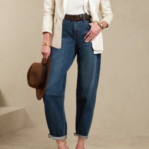 The high waisted barrel fit (wide cut that gently curves away from the leg).