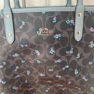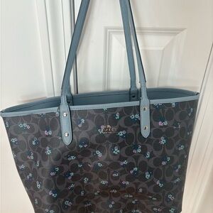Chic and spacious Coach tote. Sleek design with durable leather. Ideal for daily use. Reversible blue/floral. Good condition with some wear on the handles and bottom. Pretty bag:)