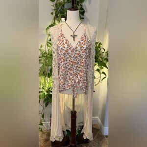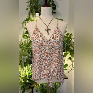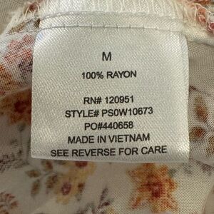 Charming floral blousy tank with button-down front. Buttons are purely decorative. Features orange and yellow flowers on a white base. Perfect for casual wear. This 100% rayon blouse is lightweight, flowy and soft.