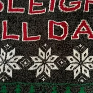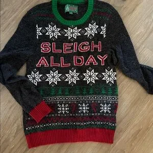 Embrace the holidays with this gray crewneck sweater. Features festive red and green patterns. Ideal for seasonal celebrations.
