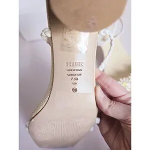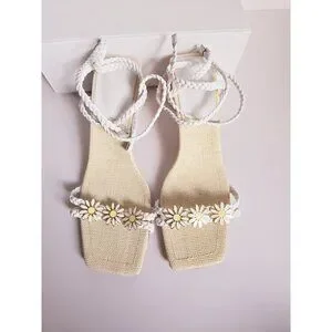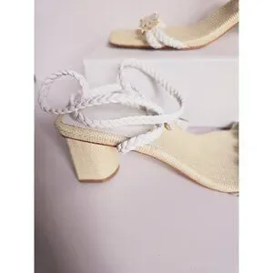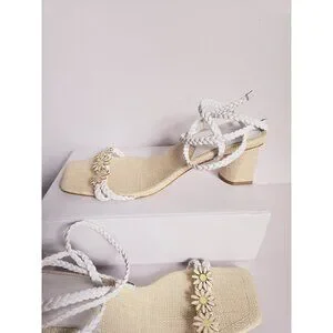 Schutz Hina Daisy Fairy Rafia Floral Lace Up White Block Heels Sandals Shoes 7.5