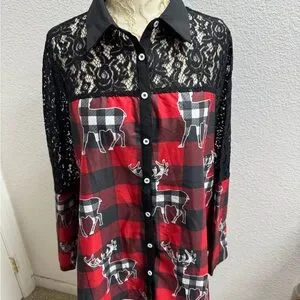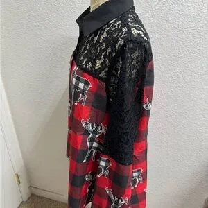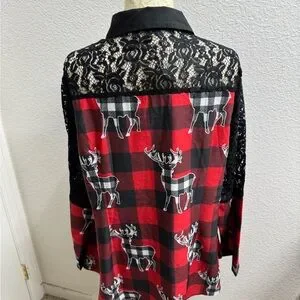 Red and black buffalo plaid shirt with lace details. Features button-up front and deer pattern in white and black buffalo.