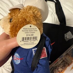 Explore space with this -themed set featuring a plush bear in a blue astronaut suit and a space shuttle puzzle, a bag, a pin, AND just included a snow globe . Perfect for young space enthusiasts.