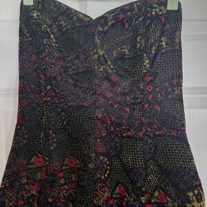 Vintage strapless mini dress. Not sure of the brand or size since there aren't tags but it fits like an XS/S. It has a velvet feel and is a gorgeous black with red and green floral pattern. The bottom has layers and it zips up the back.