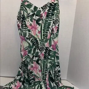 Elegant dress with a vibrant floral pattern. Features green leaves and pink flowers.