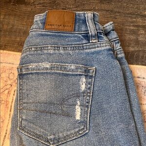 Light blue jeans with distressed details. Features a back pocket and leather brand patch.