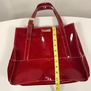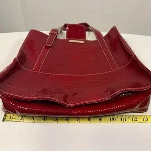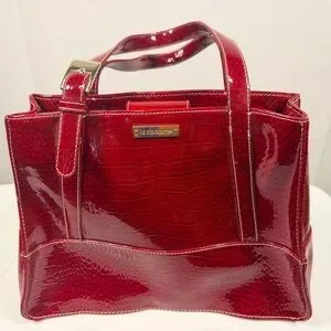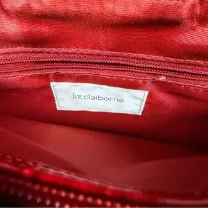 This Liz Claiborne burgundy patent shoulder tote bag is elegant and perfect for any occasion. Its sleek design and vibrant color make it a standout accessory.