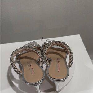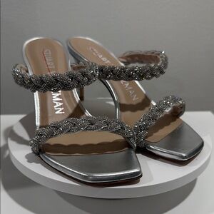 Chic Stuart Weitzman heels with metallic silver braided straps. Perfect for adding elegance to any outfit.