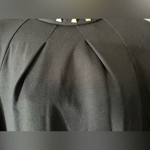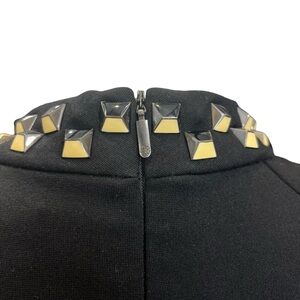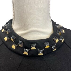 Chic and edgy Trina Turk sheath dress in classic black featuring a striking studded neckline with gold and black pyramid embellishments. This long sleeve dress has a flattering silhouette with front pleats, hidden back zipper, and fully lined interior. Perfect for cocktail parties, evening events, or an upscale date night look.