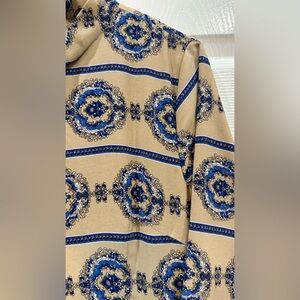 Elegant dress by Dainty Jewells. Features intricate blue patterns on a tan background. Perfect for a sophisticated look.