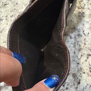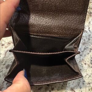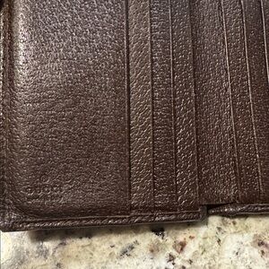 Gucci Blooms wallet. On the front there is a coin compartment that has 2 sections and closes with a snap. The back has 6 card slots and 1 bill compartment that also closes with a snap. The interior is brown leather. Call-outs: A small amount of coin residue in the coin pocket (can barely be seen). Rubbing on the canvas and piping (outside of the wallet). All metal is silvertone.