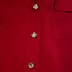 Chic red button-down shirt with front pockets. Ideal for versatile styling.
