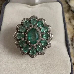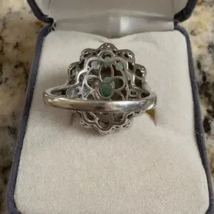 Natural Zambian Emerald and White Zircon ring in an oval floral shape. Sterling sliver stamped with a finished under gallery for comfortable wear. Size 8. Acquired from a vintage estate sale.
