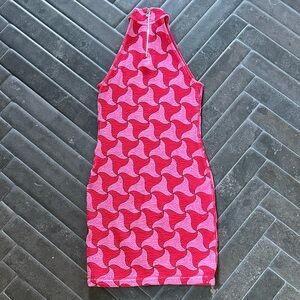 Elegant halter top with a dynamic pink and red swirl pattern with zipper detail in the back. Ideal for a chic statement.