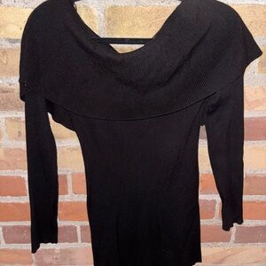 Chic off-the-shoulder design. Sleek black color. Features a bow in the back. Perfect for the upcoming holiday season!