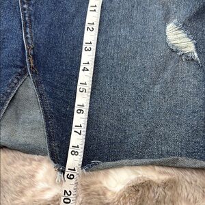 Slanted front seam down skirt; released hem; destruction at front left side of skirt; fading and whiskering at upper thigh; dark wash