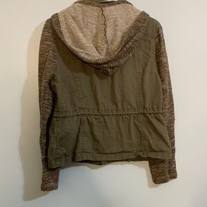 Stylish utility jacket with a hood. Features multiple pockets and a drawstring waist.