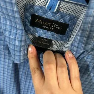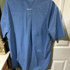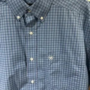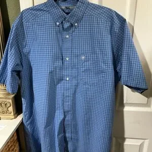 Classic blue plaid pattern. Perfect for everyday wear. Button-down style with short sleeves.