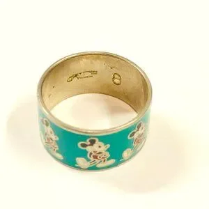 Mickey Mouse ring from circa the 1970s. Cloisonne-style design with silver tone metal and a turquoise-green enamel background. Depicted around the ring are seven Mickeys in the same bashful pose. Stamped inside with "Walt Disney Prods." and "8" for the size. In good vintage condition with some spots on the inside of the band and the outside is in fairly good shape. Regular wear and use. Metal used is unknown, but does have spots (please see pictures). Super cute for the Disney fan that wants to be subtle in showing your Mickey Mouse love!