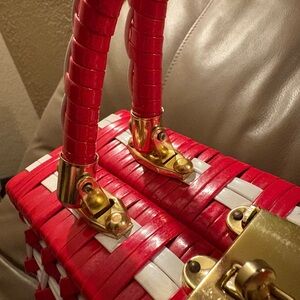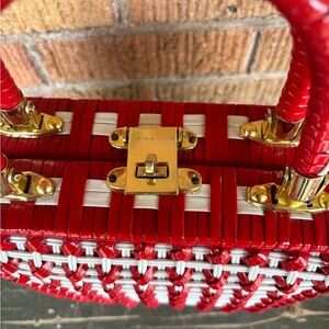 This is a Vintage 1950s-1960s Red White Coated Wicker Top Handle Structured Handbag! Seems to be quite rare; I couldn’t find any others listed.