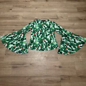 Bell-sleeved woman’s blouse featuring a cactus print. Shirt is sized at a small, but it fits loose. Shirt is in gently used condition and has no rips or stains.